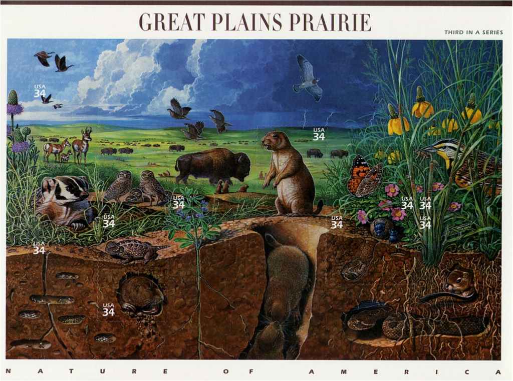 The varied tapestry of the tallgrass, mixed-grass, and short-grass prairies reaches from the eastern woodlands and oak savannas to the foothills of the Rockies. Grasses and wildflowers make good use of limited rainfall, and fire helps sustain the ecosystem. Prairies provide habitats for many animals, including the pronghorn — North America’s’ fastest land animal — and the prairie dog, one of many burrowing animals that live on the prairies